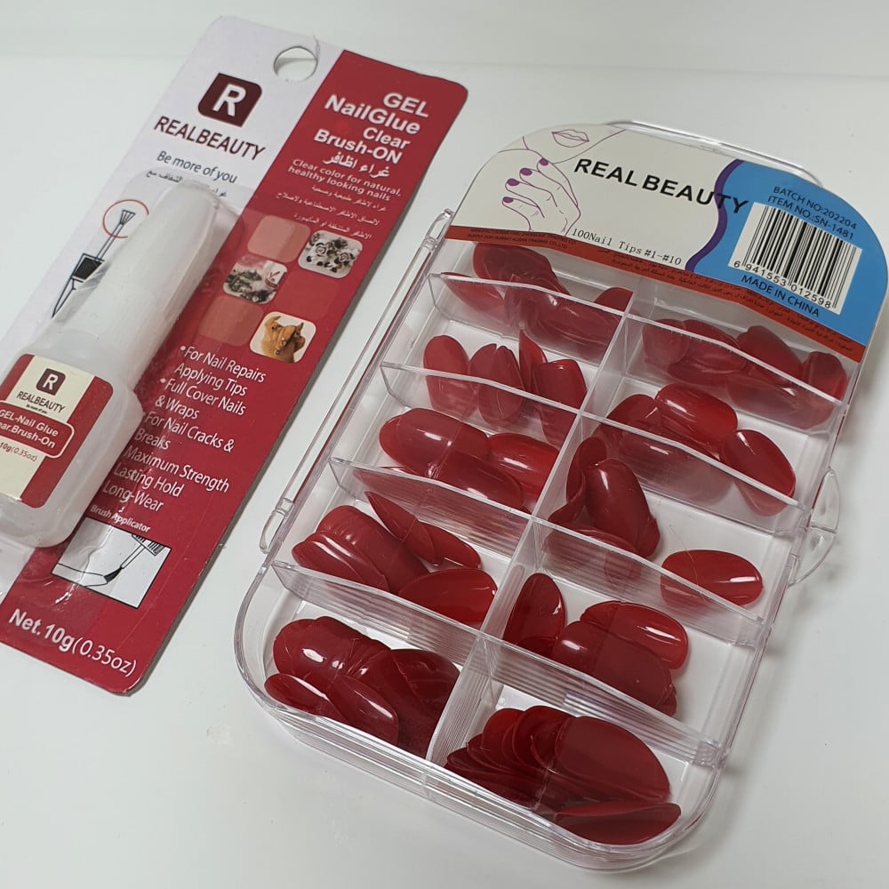 مجموعة اظافر اصطناعية 100 حبه , احمر غراء اظافر هديه