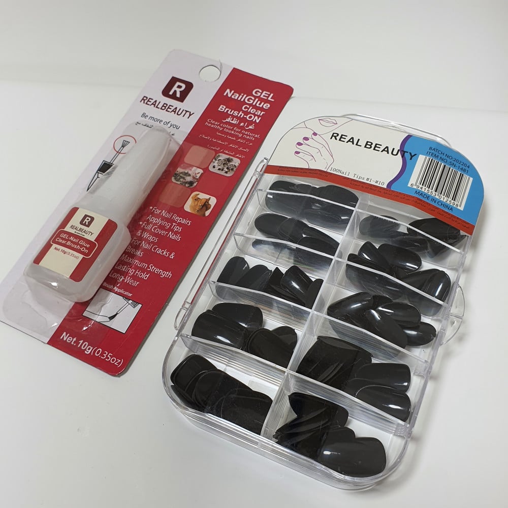 مجموعة اظافر اصطناعية 100 حبه , اسود غراء اظافر هديه